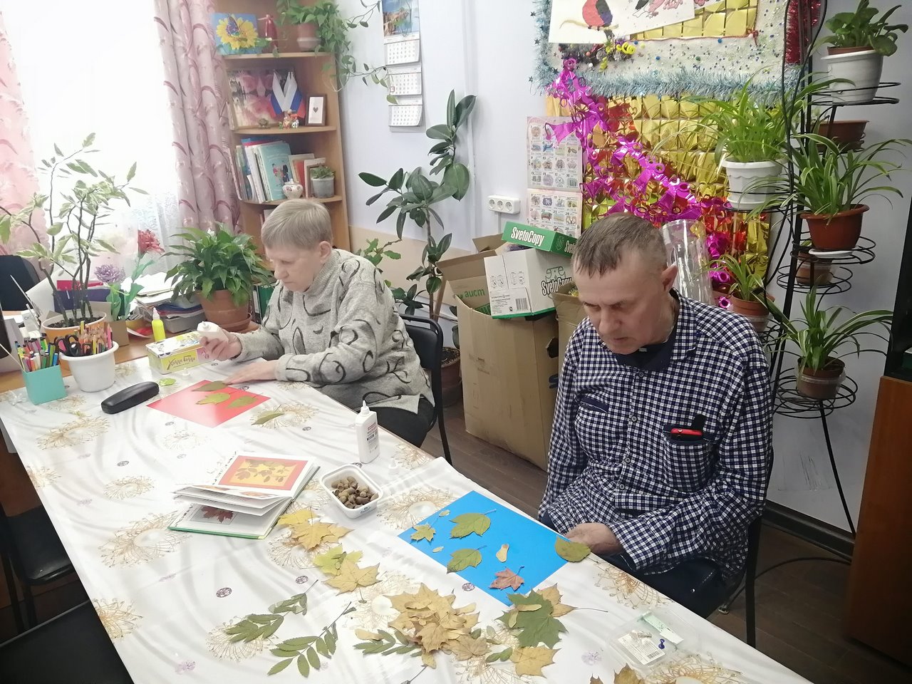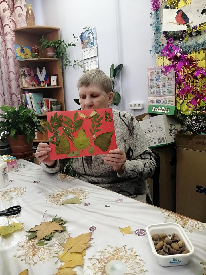 Из осенних заготовок проживающие делали лесной пейзаж. Оказалось не просто подбирать гербария для картины.
