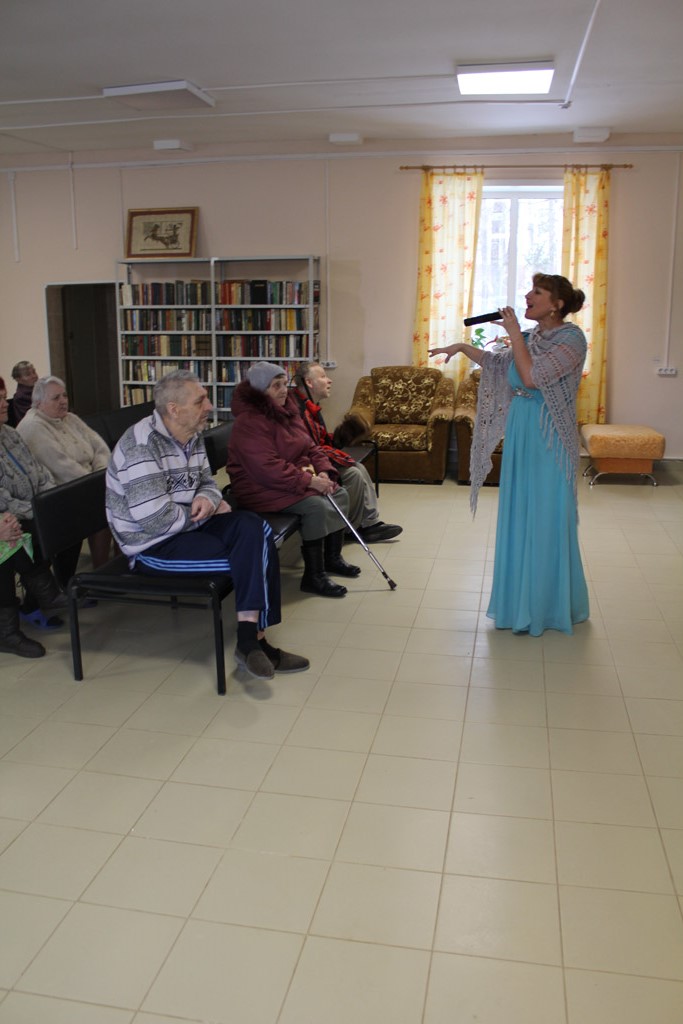 Музыкально-поэтические вечера «Все начинается с любви» прошли 17 февраля для проживающих на отделении медицинского обслуживания и отделении активного долголетия. Это был настоящий праздник любовной лирики и русского романса. В исполнении Татьяны Григорьевой прозвучали лирические стихотворения Александра Пушкина, Сергея Есенина, Анны Ахматовой, Марины Цветаевой и Евгения Евтушенко. Прекрасные русские романсы «Любовь и разлука», «Любовь- волшебная страна», «Не отрекаются любя» подарила слушателям Галина Голубева – вокалистка Городского Дома Культуры, которая уже давно пленила сердца зрителей своим душевным и проникновенным исполнением романсов.