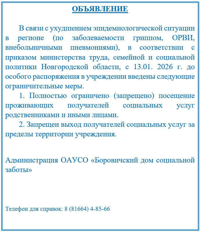 Уезжаете в отпуск, в командировку и не с кем оставить пожилого человека? Обращайтесь к нам! В отделение активного долголетия Боровичского дома-интерната в д. Железково к услугам пенсионеров и инвалидов двухместный номер с телевизором и холодильником, четырехразовое питание, медицинский контроль, а главное возможность отдыха на природе, чистый воздух, общение, посещение храма и мероприятий. Подробности по телефону 3-75-75.